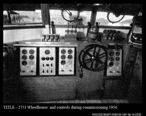 For comparison we have photographs of 2753's Wheelhouse when she was commissioned and again as she is know. I suppose the main difference is the change from three engines to two engines. ![]() Circa 1956 Circa 2006'ish ![]() Edited by d-zine |
