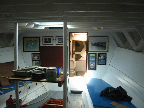 At the worst point which happened 3 times as the pipe either fell off the salvage pump or it lost suction the water was level with the toilet seat in the head and then in the next compartment it was 2-3 inches over the floorboards(which were floating about) bearing in mind the bilge is about 2 feet deep and widens to about 8 feet that was a lot of water which was flowing through the doorway to the next compartment which was only about 18 inches deep but linked to the fuel tank space, I had to raise the electic connectors for the bilge pumps 3 inches to keep them out of the water! Luckily the engine compartment was watertight and was no problem. The trip round was only about an hour but the sea was a bit 'choppy' and it was as much as me and my mate Tom could do to keep the pumps all pumping and stay on our feet! luckily we had a very experienced skipper with us who kept calm throughout, I think I hid my fear quite well as if I had had a spare second I may have soiled my underwear! Tom also concealed his state of panic until we had tied up in we left the skipper in