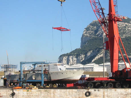 I think that we decided that Flywood was about 12 tons as she was only drawing a couple of inches of water at the transom. She was lifted from the water using the quayside crane in the picture using a spreader and 2 straps (this resulted in minor damage to the chin strakes) which were located over the bulkheads to give maximum rigidity to the hull. She was then lowered onto the cradle where four straps were used (a better solution if you can manage it) and she was moved to the correct place on the quay where she is currently secured. In an ideal world you should try to pack out around the chin to spread the load, I had considered trying to fabricate mini cradles for the bearing points but I had no time.