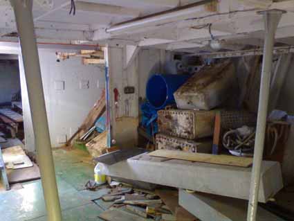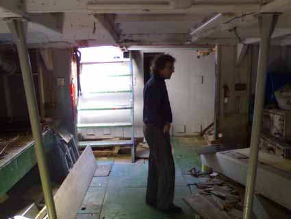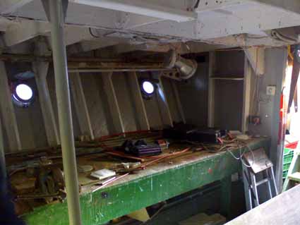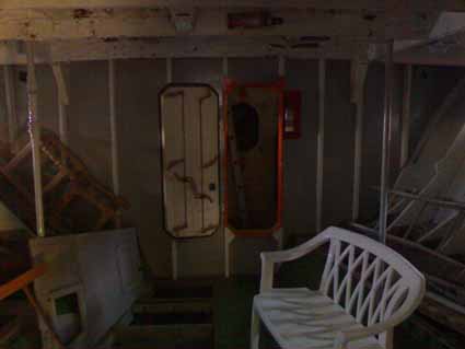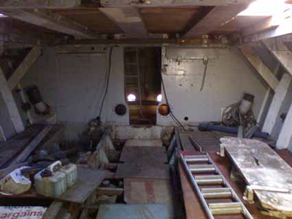 She has a quantity of materials and parts within the hull. The bulkhead between the engine room and fual tank space has been partially removed as has the bulkhead between the fuel tank space and the sickbay, all other bulkheads remain in situ.