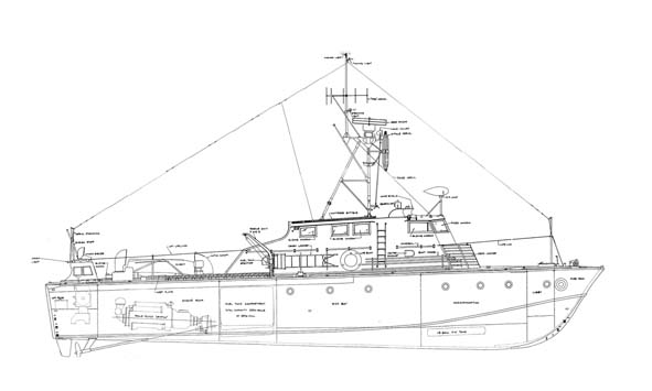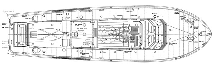 Another drawing has been copied from the builders general arrangment plans dated 1956. This shows the deck arrangment, note the engine room hatch facing aft because of the flush engine room roof. On MkII's the raised engine room roof required the hatch to face to the port side.